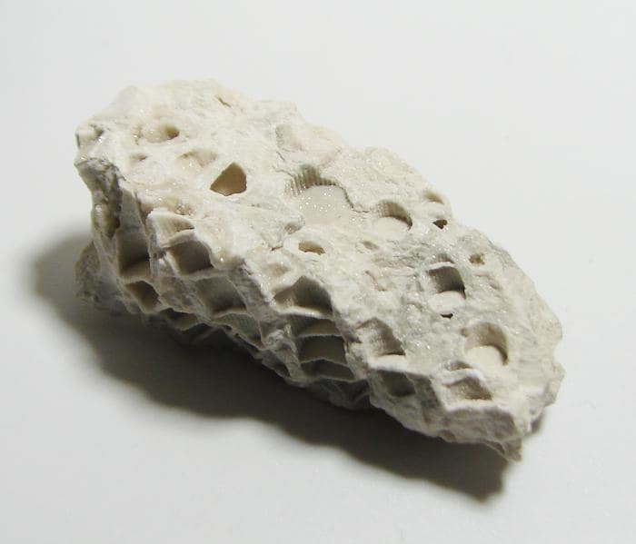 The term "druzy" refers to the layer of fine, sparkling crystals (often calcite or quartz) that have grown within the empty coral tubes or cavities.
