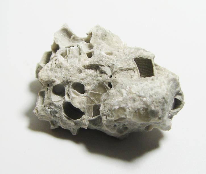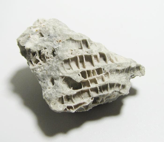 The fossil is formed from ancient coral, where the original calcium carbonate structure was replaced by silica-rich groundwater over millions of years.