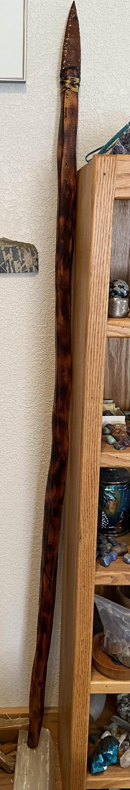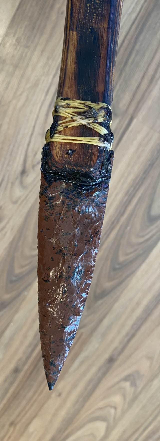 The Native American-inspired spear is crafted with genuine Osage Orange, which is fire-hardened for durability. The 6” Mahogany Obsidian Arrowhead Point is set in authentic pine pitch from Ponderosa Pine trees and ash from burnt charcoal and wood. It has been laced with artificial sinew. This is functional wall-hanger.