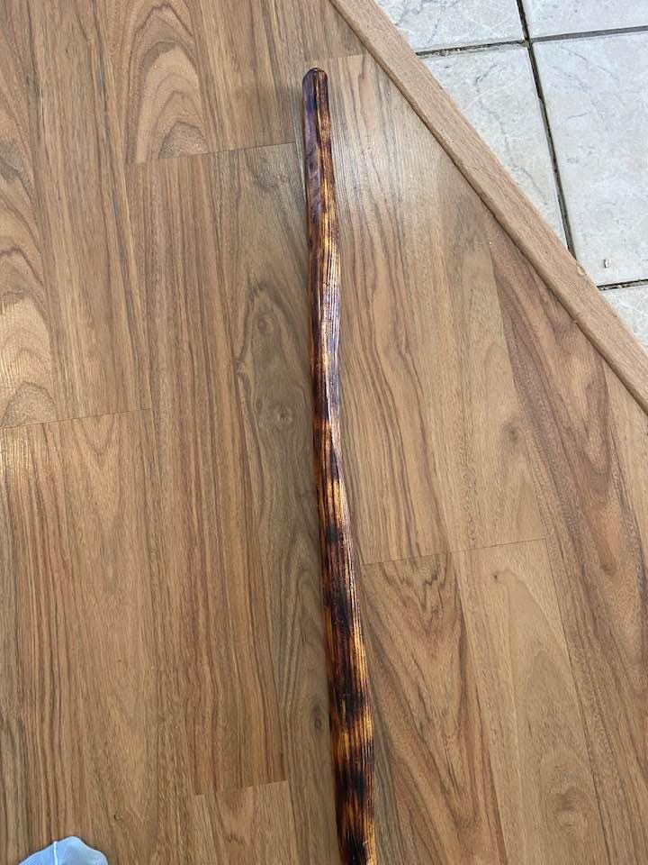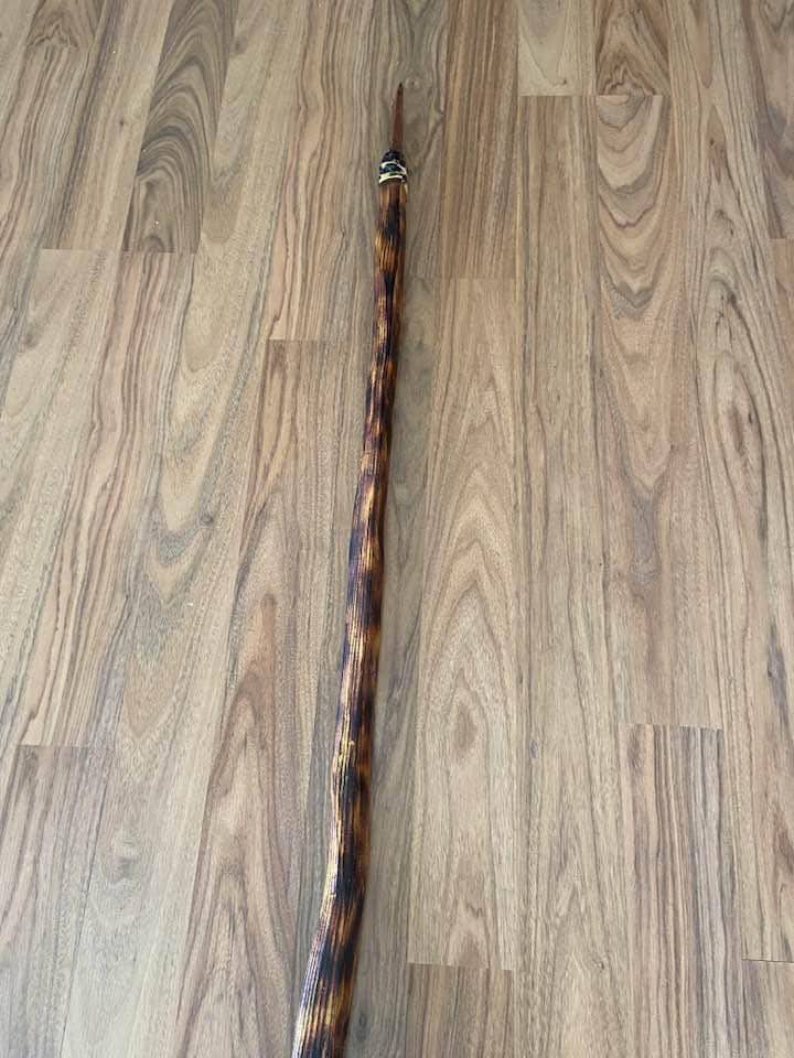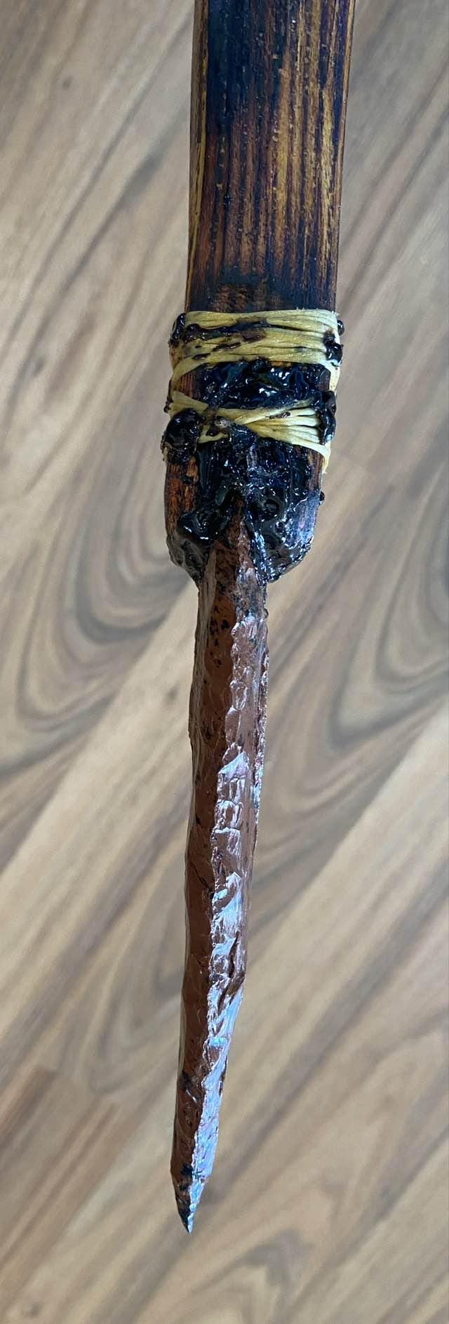 The Native American-inspired Hunting spear is crafted with genuine Osage Orange, which is fire-hardened for durability. The 6” Mahogany Obsidian Arrowhead Point is set in authentic pine pitch from Ponderosa Pine trees and ash from burnt charcoal and wood. It has been laced with artificial sinew.