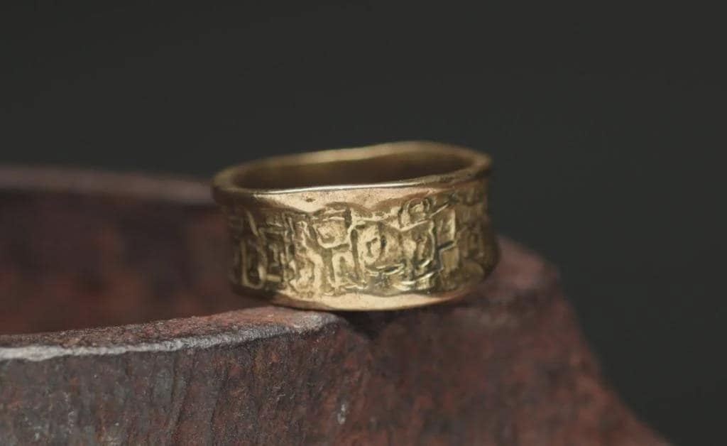 The exterior of the band features a continuous wrap-around relief design depicting various figures and symbols in a primitive or folk-art style. The casting exhibits a rugged, artisanal texture with a natural aged golden-bronze patina over the base alloy. The interior of the shank is smooth but shows some casting pits and irregular surfaces consistent with sand-casting. The band has a slightly concave profile and uneven edges, adding to its handmade character. Significant surface wear and oxidation are present, particularly in the recessed areas of the relief. A unique piece of ethnographic or artisan-style jewelry.